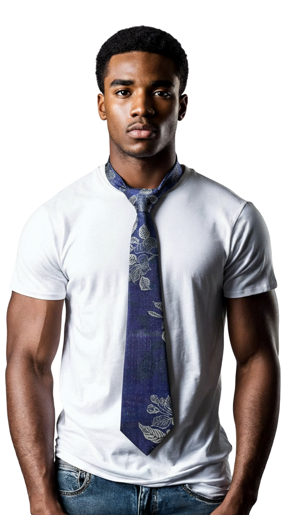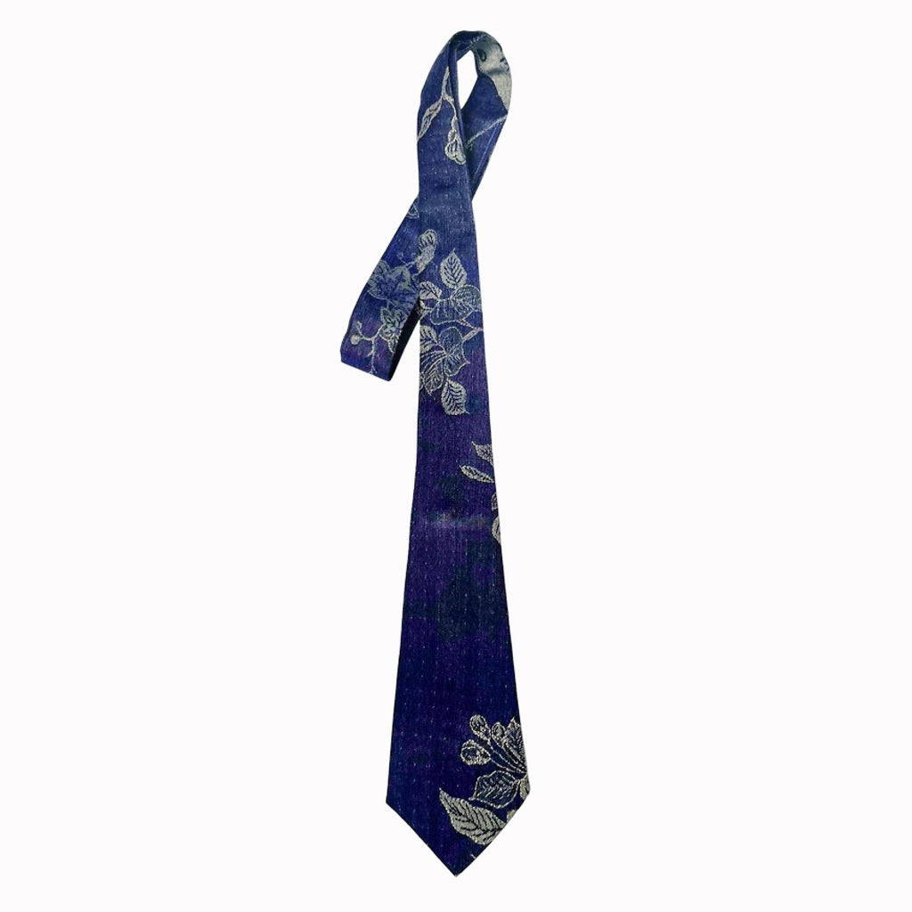 Handwoven from cashmere and silk, (80%:20%); in navy blue with silver etched leaves; every tie is unique
